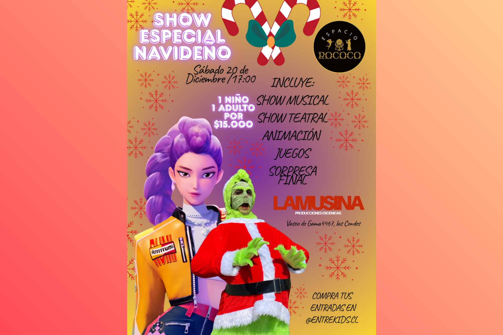 Este sábado 20 de diciembre a las 17:00 hrs, Espacio Rococó se transforma en un mundo lleno de magia, música y diversión con el SHOW ESPECIAL NAVIDEÑO, un panorama imperdible para disfrutar en familia.