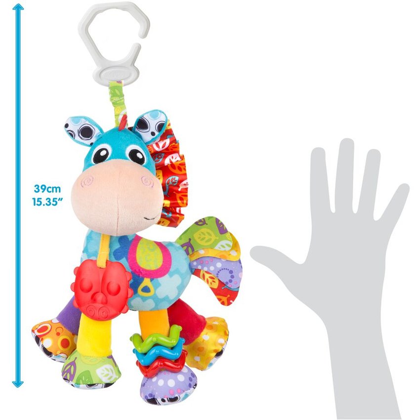 Amigos Y Actividades Clip ClopÚnete al bebé y Clip Clop mientras se preparan para la diversión multisensorial. La melena satinada, los anillos de clic y los pies arrugados fomentan las habilidades motoras finas a medida que el bebé explora las diferentes texturas. Los patrones y colores contrastantes brillantes comprometen y estimulan la percepción visual y el pie de traqueteo promueve el desarrollo auditivo. Un mordedor masticable y con textura es perfecto para que el bebé calme las encías adoloridas mientras viaja. Con un práctico clip para sujetarlo rápidamente al asiento o cochecito del auto, el Clip Clop hará que el bebé muerda en la broca.Infanti Toys