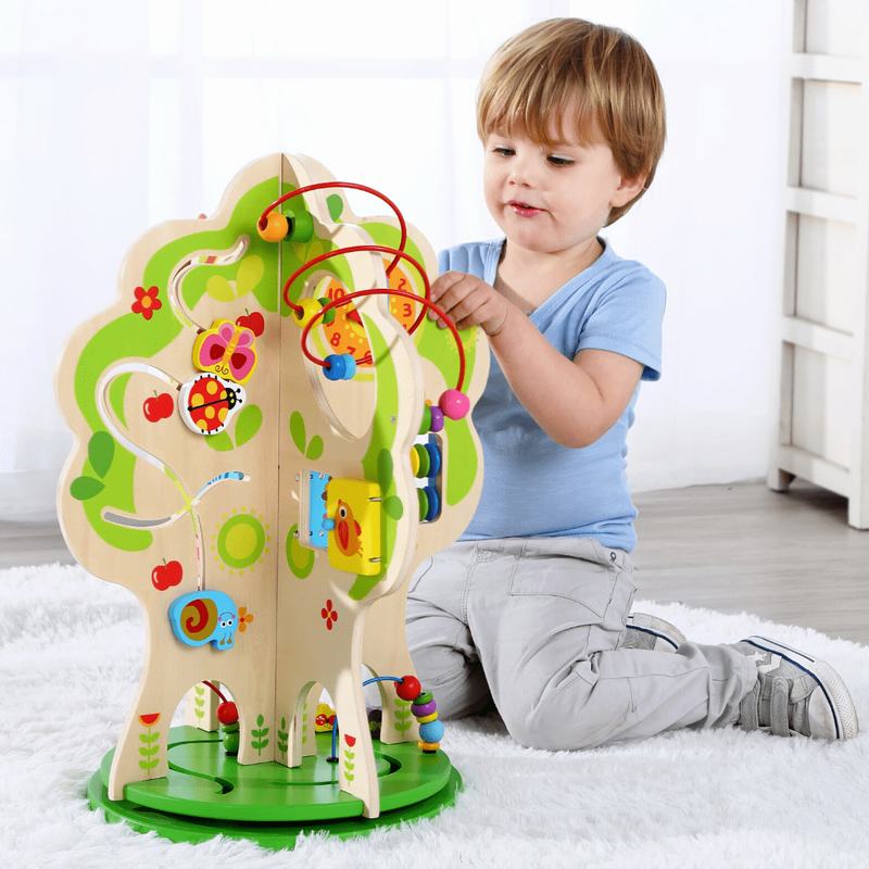 Árbol de madera y centro de actividades rotatorio, marca Tooky Toy, incluye ábaco, reloj, prono supinador, espejo, secuencia, laberinto, presentado en base giratoria. Madera de vivos colores, resistente , de gran tamaño altura permite interacción a nivel del niño o niña!