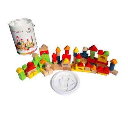 Material madera. Contiene 100 bloques en diferentes colores y formas para crear variadas estructuras.