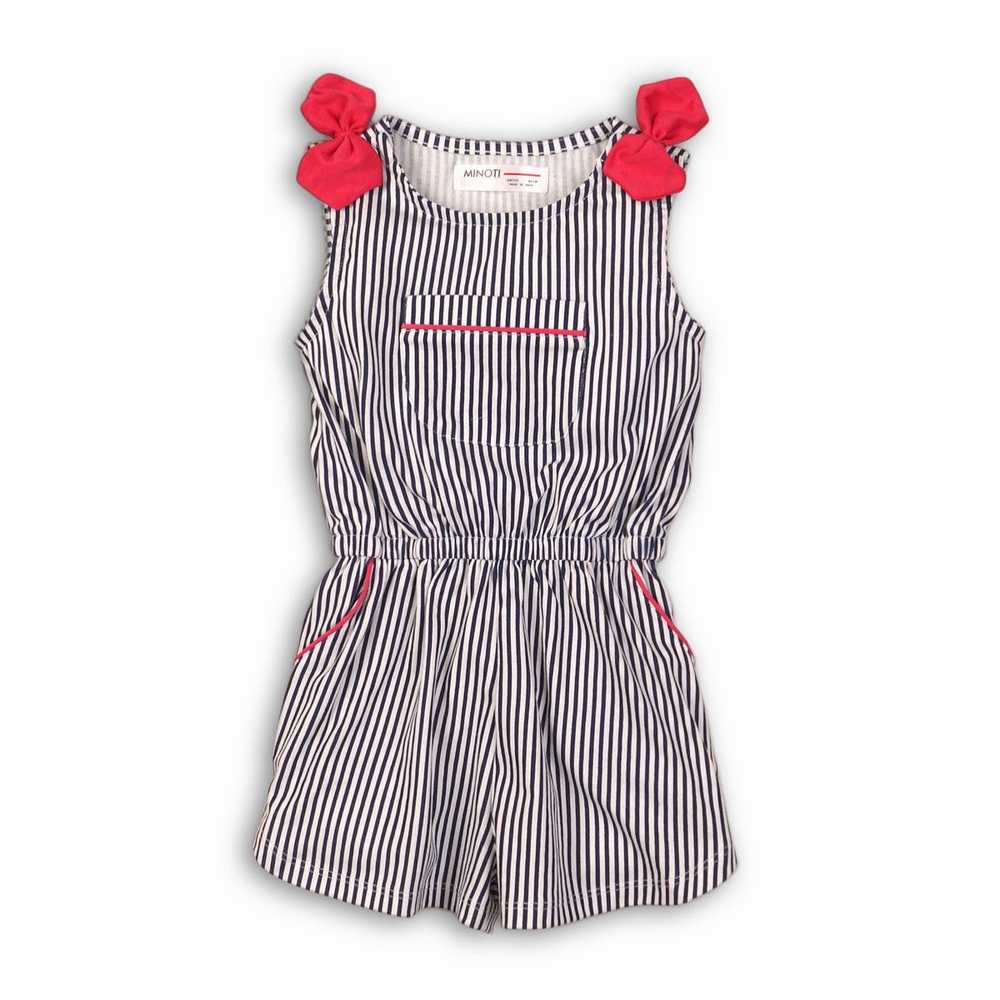Mono corto a rayas para niñas con bolsillo frontal en el pecho, cinturilla elástica y bolsillos con ribete en contraste. Detalle de lazo en contraste en los hombros