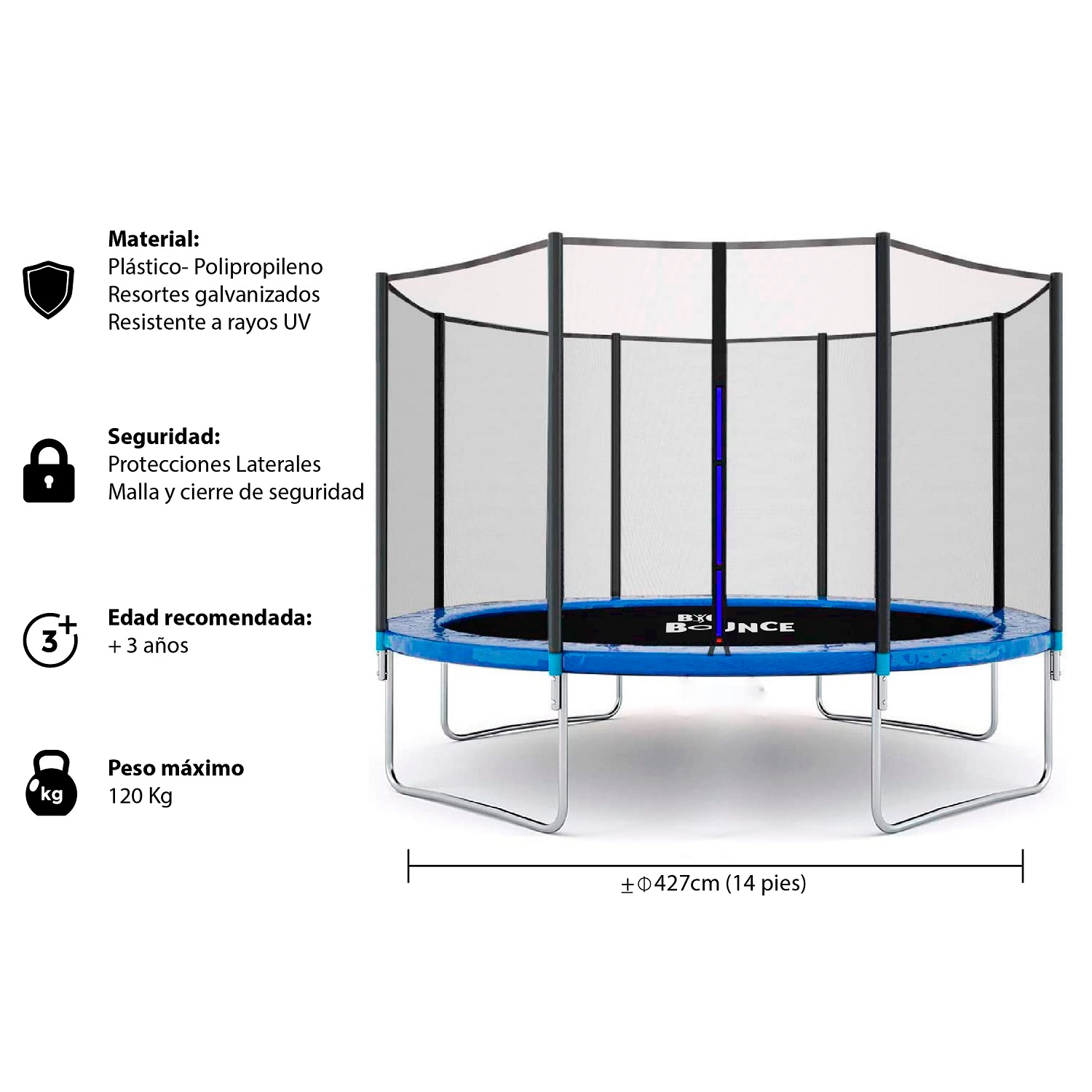 Cama elástica de 14 pies (4.27 mts) para disfrutar en grupo. Su estructura de acero galvanizado, la convierte en una cama estable, segura y de calidad, al mismo tiempo incentiva el ejercicio y la diversión. Es de fácil armado para todo tipo de persona. Cuenta con malla de seguridad para no permitir las caídas fuera de la cama elástica. Se recomienda utilizar bajo la supervisión de un adulto; incluye cobertor de seguridad acolchado y herramientas para su montaje.