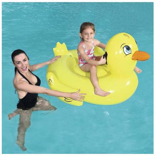 El flotador inflable Pato Montable de color amarillo, que nos presenta la marca estadounidense Bestway posee asas resistentes, para brindarle la máxima protección y diversión a los más pequeños del hogar este verano. Se puede usar en la piscina y jugar, manteniéndose a flote en todo momento. Cuenta con válvula de seguridad y tiene unas dimensiones de 1.35 m x 91 cm. Está fabricado en vinilo de alta resistencia. Su máxima capacidad de carga son de 45 kg (edad recomendad es entre 3 y 6 años). Incluye parche de reparación.