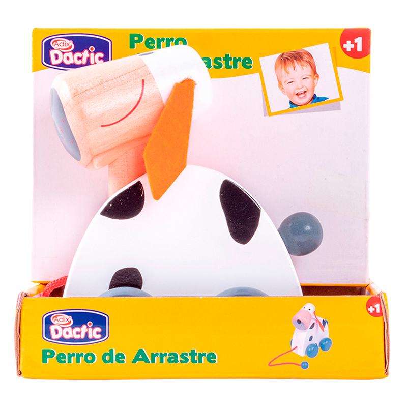 Perro de madera con cordel para tirar. Un juguete que permite desarrollar la coordinación motriz gruesa y potenciar la actividad física de los niños que dan sus primeros pasos. Contiene una pieza de madera de hasta 8,5 x 8,5 cm aproximadamente. Recomendado para niños desde el primer año de vida.