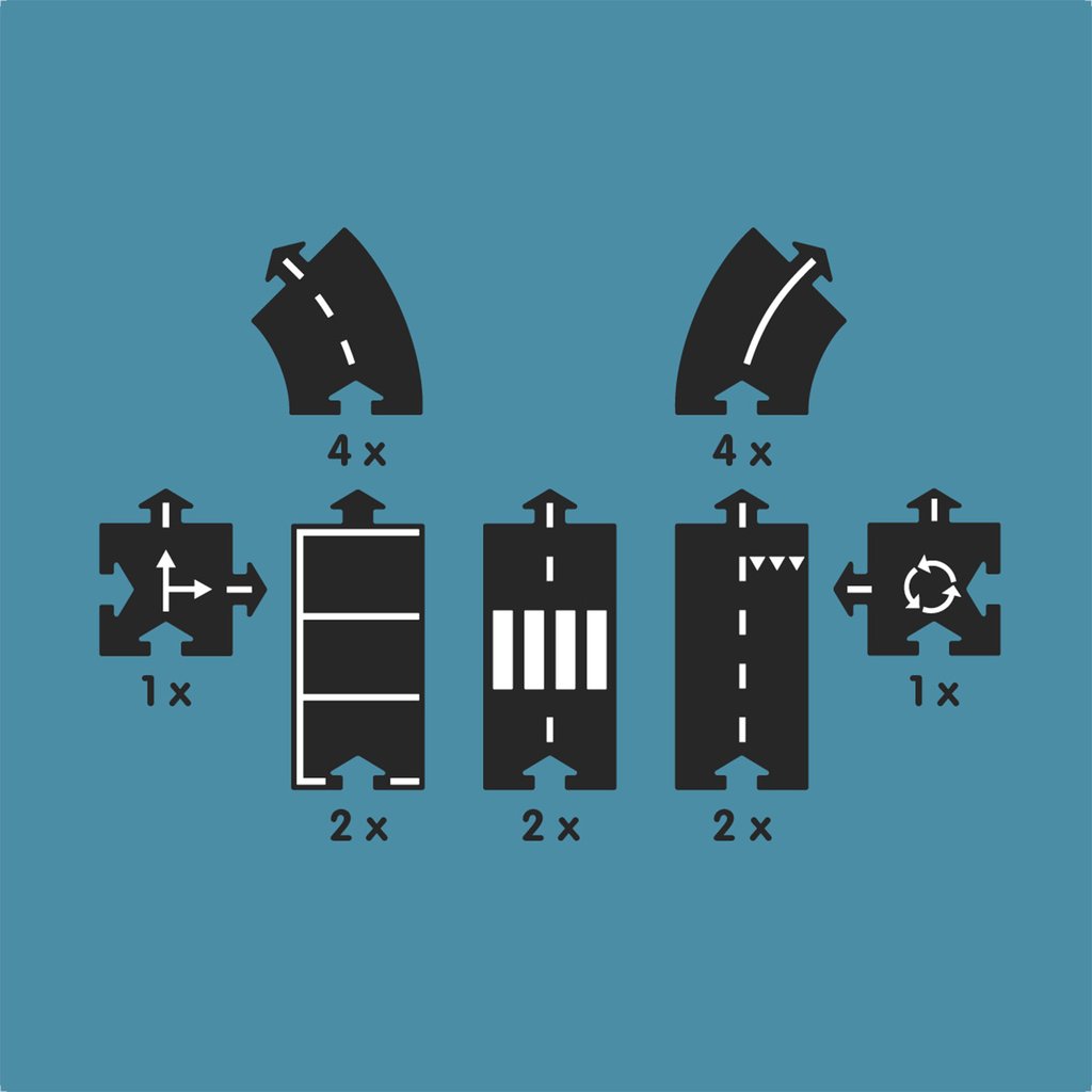 — Incluye: 16 piezas (8 curvas, 6 rectas, 1 intersección y 1 rotonda)