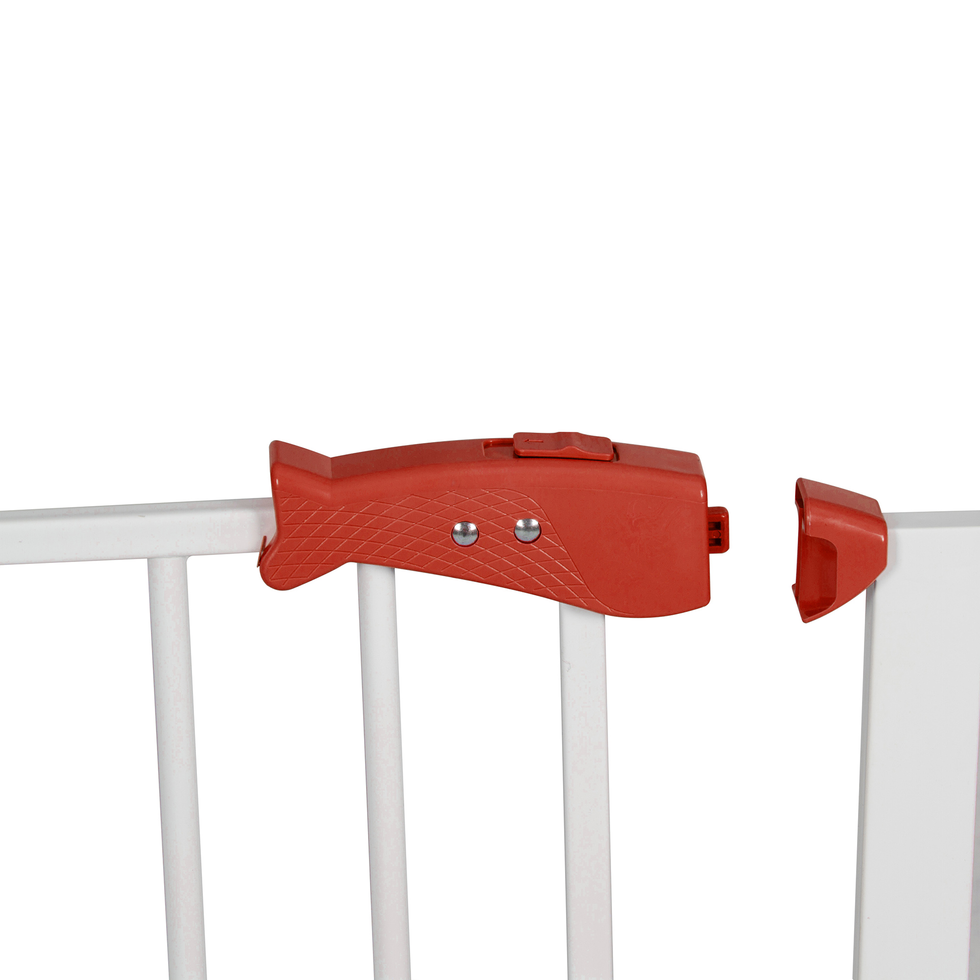La reja es de color blanca, los broches de seguridad de la puerta y los topes de fijación son de color.