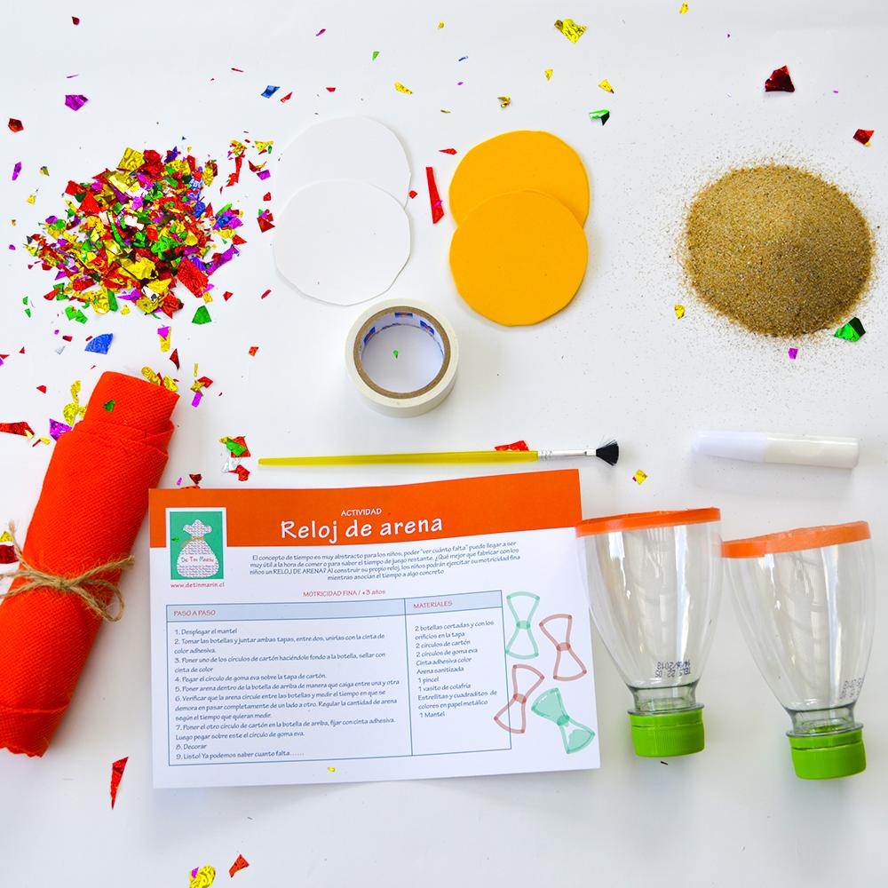 El concepto de tiempo es muy abstracto para los niños, poder “ver cuánto falta” puede llegar a ser muy útil a la hora de comer o para saber el tiempo de juego restante. ¿Qué mejor que fabricar con los niños un RELOJ DE ARENA? Al construir su propio reloj, los niños podrán ejercitar su motricidad fina mientras asocian el tiempo a algo concreto. +3años