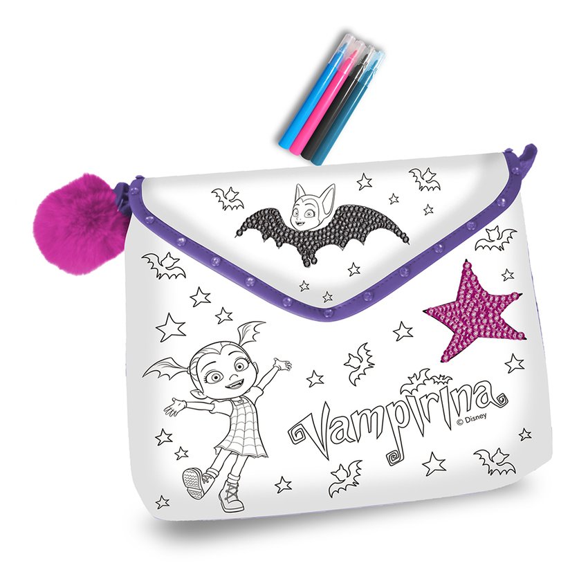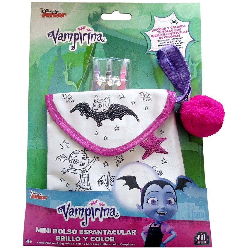 El Mini Bolso Espantacular Brillo y Color de Vampirina incluye un bolso para colorear y rotuladores de colores. ¡Tiene lentejuelas de colores impresas! ¡Woow! ¡Lucirás monstruosa como Vampirina! Edad recomendada a partir de 3 años. La historia de Vampirina refleja cómo el ser diferente no debe ser un obstáculo, sino todo lo contrario. Se trata de una niña vampira que debe adaptarse a la nueva ciudad junto a su familia. Se trasladarán desde Transilvania a Pennsylvania donde Vampirina tendrá que hacer nuevos amigos sin renunciar a su esencia, ser una chica Vampiro en un mundo de humanos. Divertidas aventuras le esperan